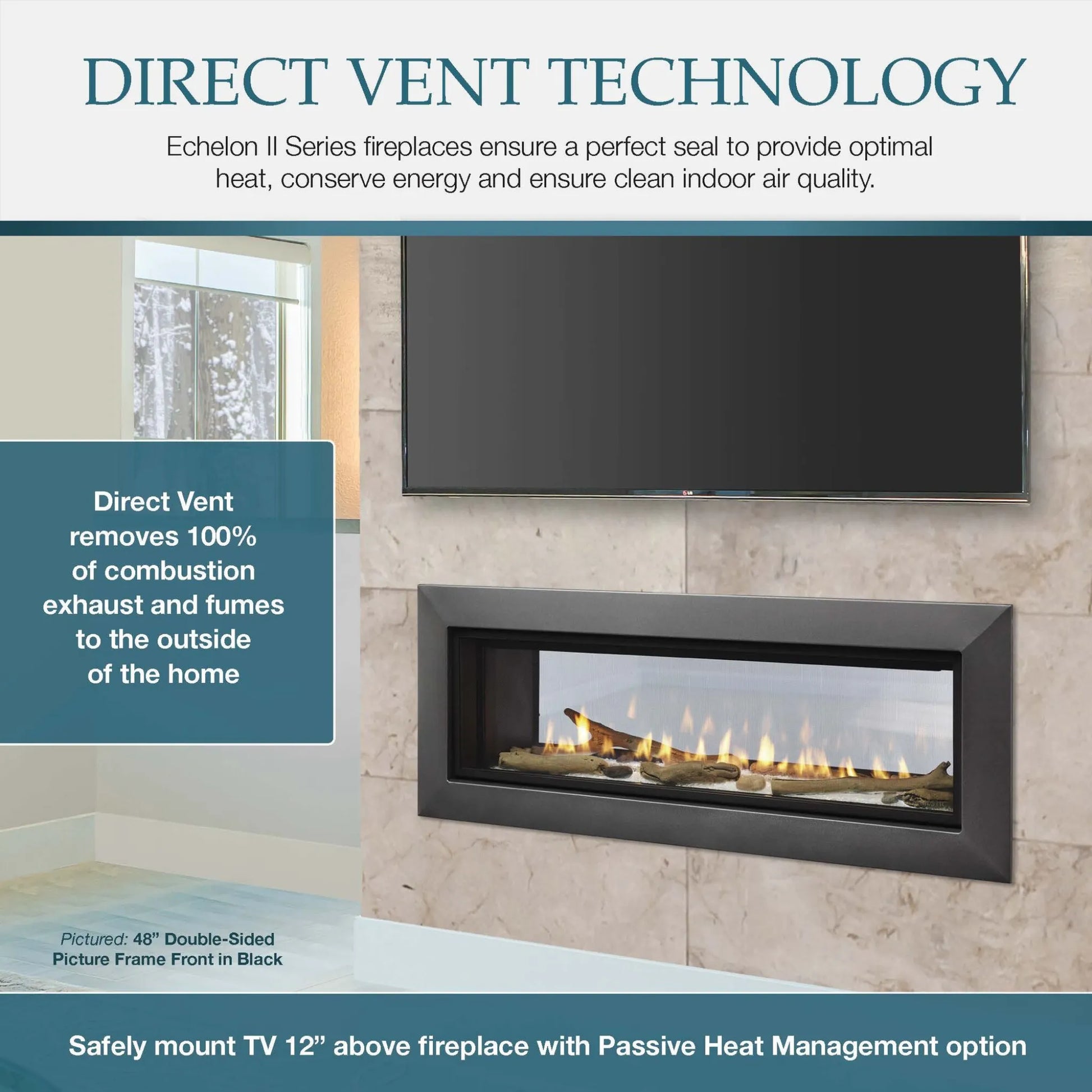 The Majestic Echelon II Direct Vent Gas Fireplace offers a sleek, contemporary design that enhances any living space. Its expansive glass panels provide a captivating view of active flames, creating a warm and inviting atmosphere. With customizable interior options and LED ember bed lighting, you can tailor the fireplace to match your décor. The IntelliFire Touch ignition system ensures convenient control, while the direct vent technology efficiently expels combustion exhaust, maintaining clean indoor air. Whether you're entertaining guests or enjoying a quiet evening at home, the Echelon II fireplace combines style and functionality to elevate your living experience.