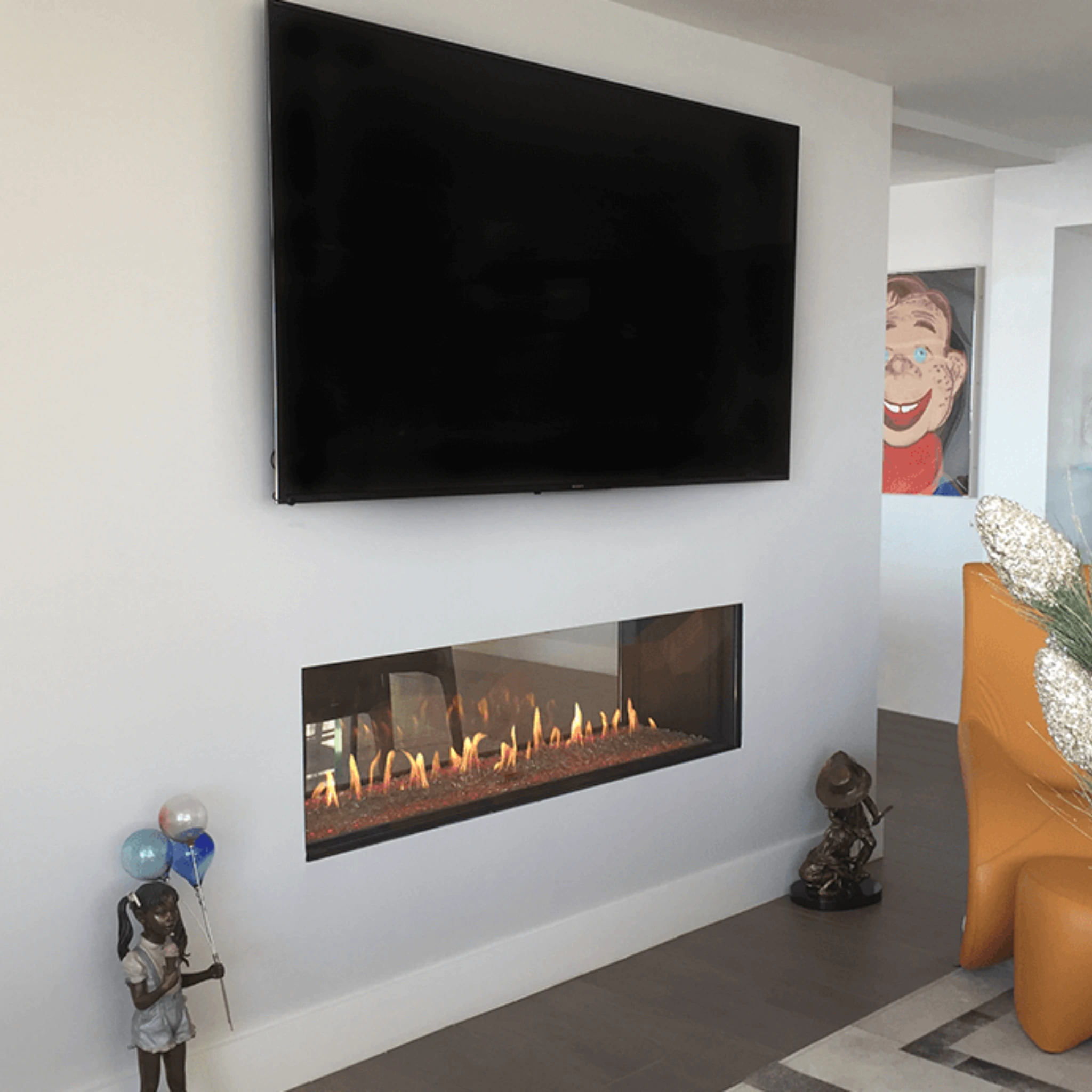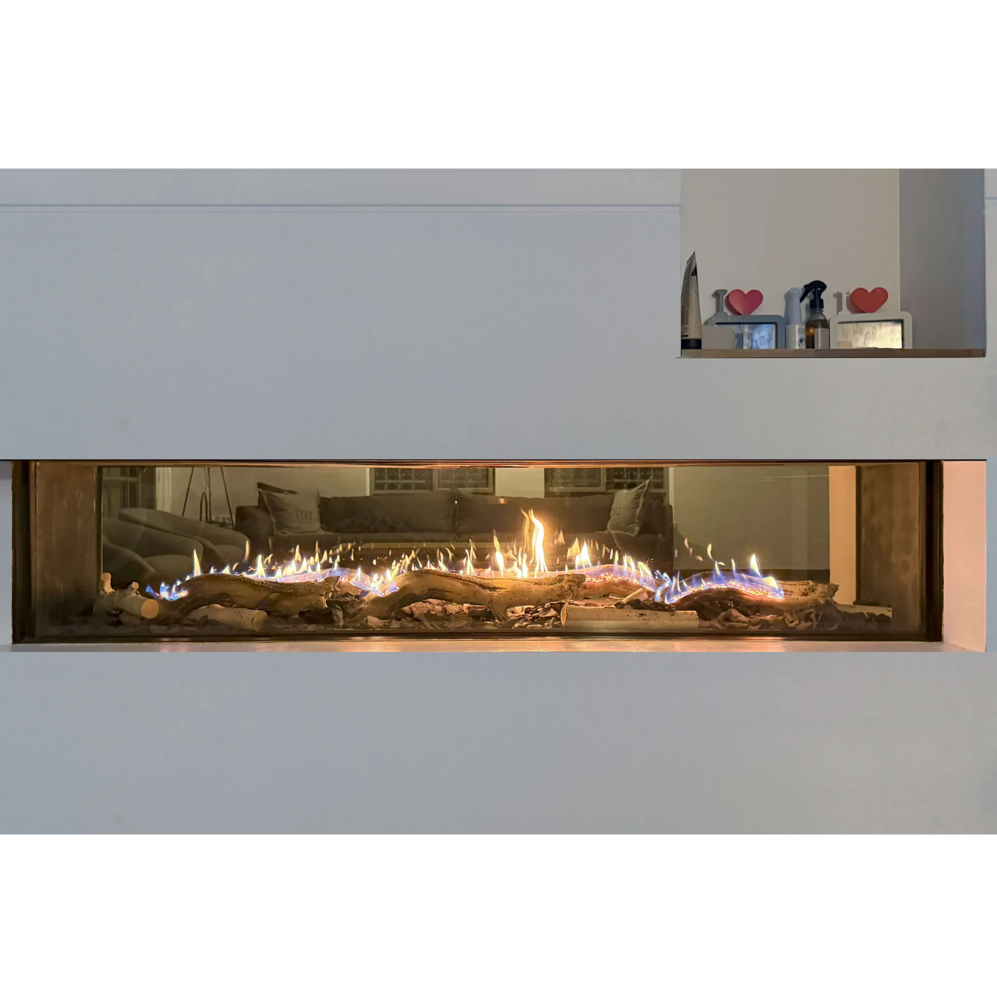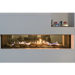 The Flare See-Through Fireplace transforms two adjoining spaces into a cohesive, inviting retreat by offering a stunning, transparent view of fire from both sides — ideal for open floor plans, room dividers, or indoor-to-outdoor transitions. Available in lengths from 30" up to 100" with glass-height options of 16", 24", or 30", it lets you choose a size and scale that fit your layout perfectly. Its frameless linear design and 3D stainless-steel burner deliver tall, dynamic flames that extend nearly full width, while optional double glass or invisible mesh screens keep the view clear and safe. With a modern aesthetic, customizable media and interior finishes, and flexible installation (front-facing, pass-through, or room-defining), the Flare See-Through Fireplace blends architectural elegance, true-to-life flame ambience, and functional warmth — making it a striking focal point and a versatile heating solution for contemporary homes or commercial spaces.